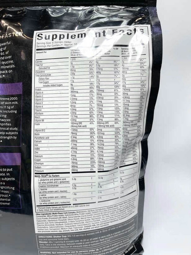 همچنین MASS-TECH EXTREME 2000 بیش از 2000 کیلو کالری (در صورت مخلوط شدن با 600 میلی لیتر شیر بدون چربی) فراهم می کند که از پروتئین وی با کیفیت بالا و کربوهیدرات های پیچیده به راحتی قابل هضم به دست می آید.
